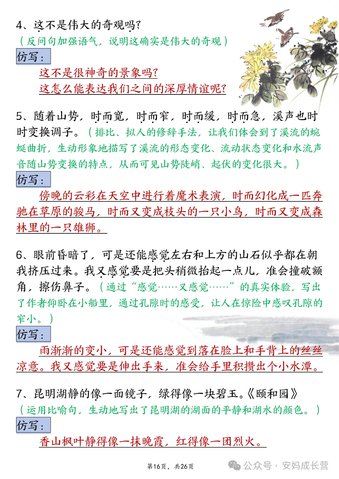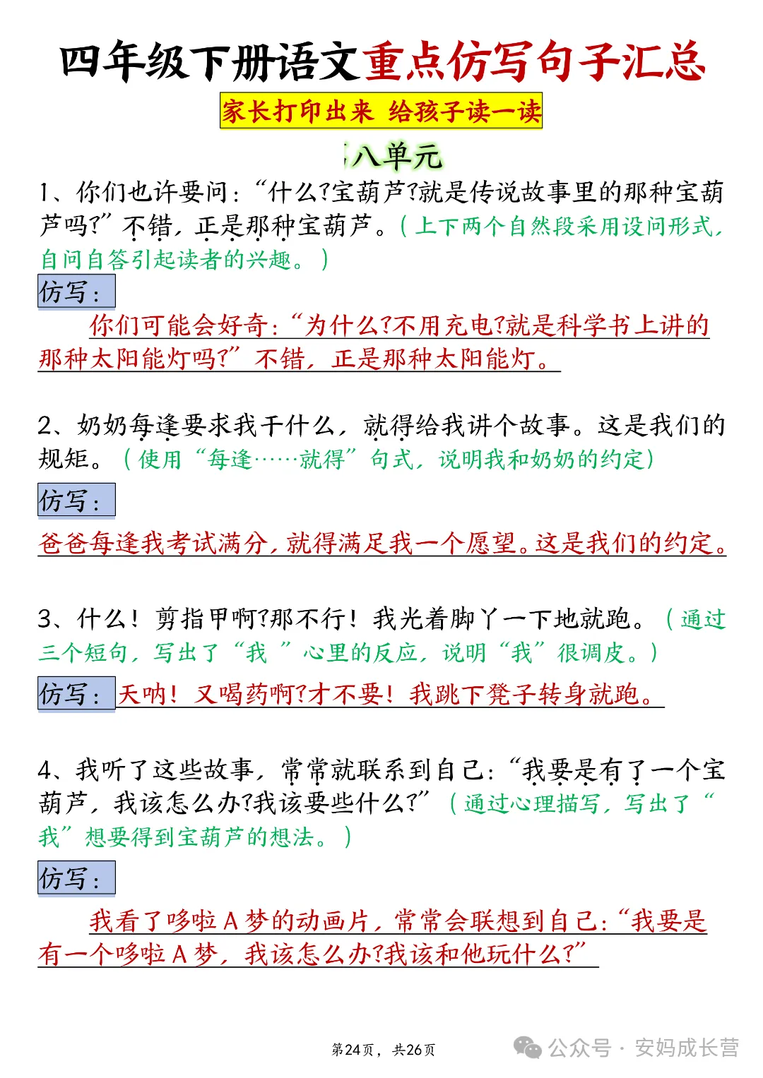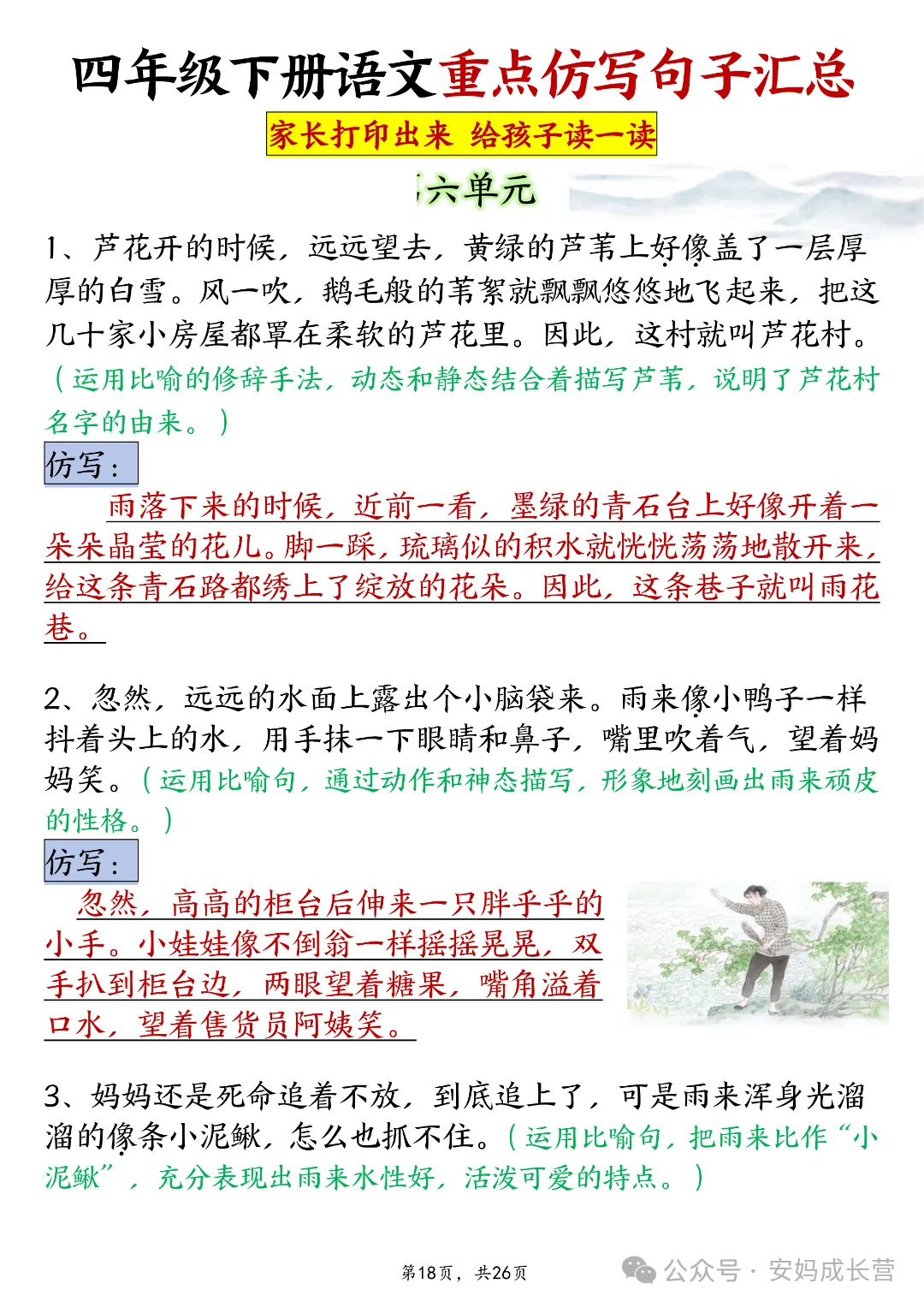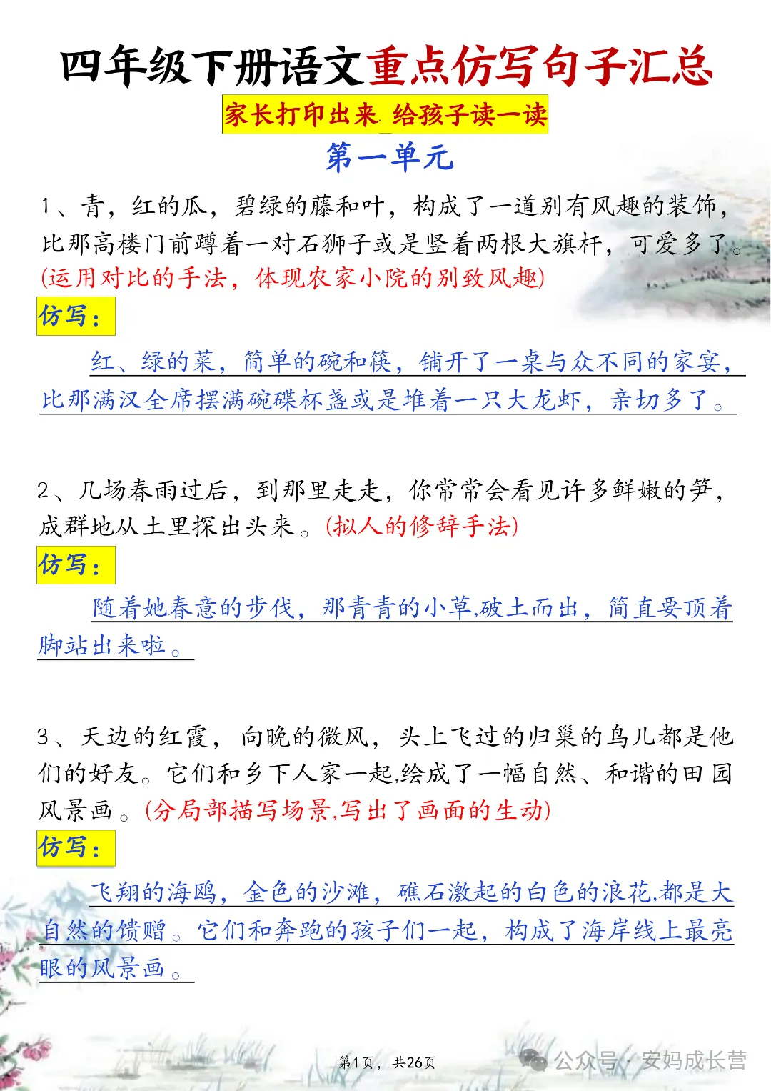四年级下册语文《全册重点仿写句子汇总》,电子版可打印