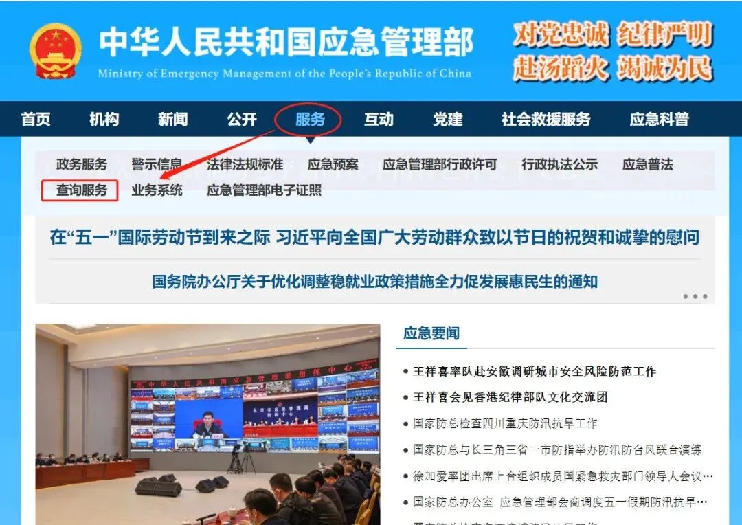 登录中华人民共和国应急管理部网站:https://www.mem.gov.cn/index.shtml从导航栏点“服务”,进入服务大厅。注:政府的官网网址后缀一般都是“.gov.cn”,大家登录的时候要留意哦!