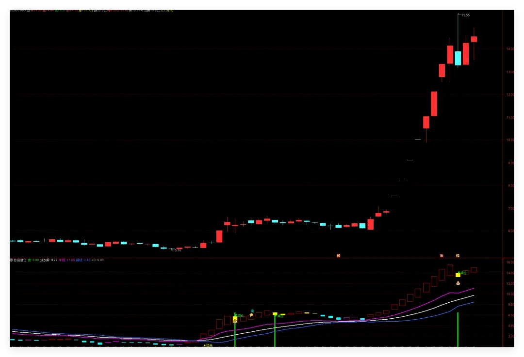 适用行情 :急跌后的超跌反弹。操作口诀 :股价新低量不低,背离信号是契机。 实操 :注意观察指标中的 XG 信号(或者看柱子颜色变化)。如果股价连续下跌,但副图的指标线(牛线/洗钱B)开始拒绝下跌甚至抬头,这就是主力在偷偷吸筹。一旦出现“建仓”红柱,果断轻仓试错,反弹一触即发。