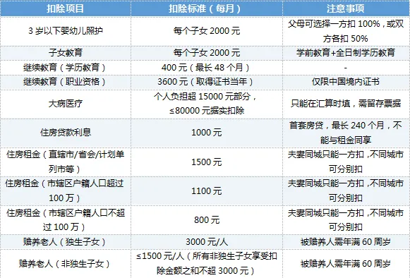 个税专项附加扣除项目列表: