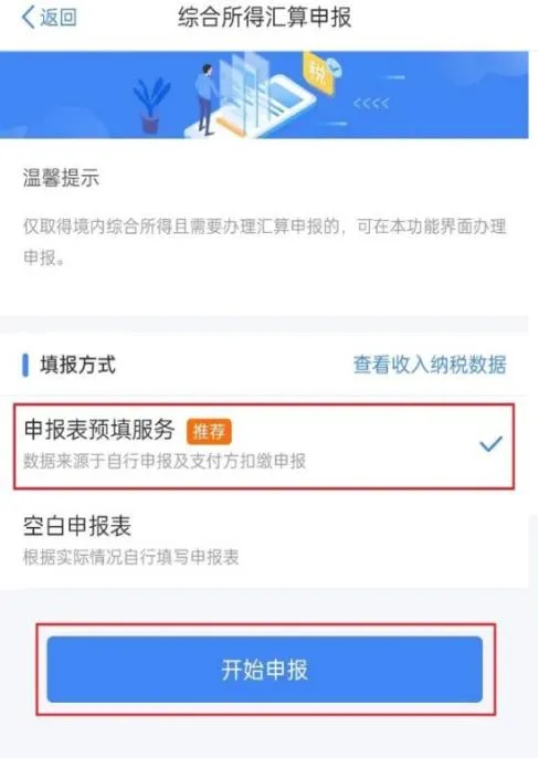 进入申报界面,选择【我需要申报表预填服务】:点击【开始申报】,系统会自动弹出申报须知,点击【我已阅读并知晓】。