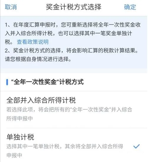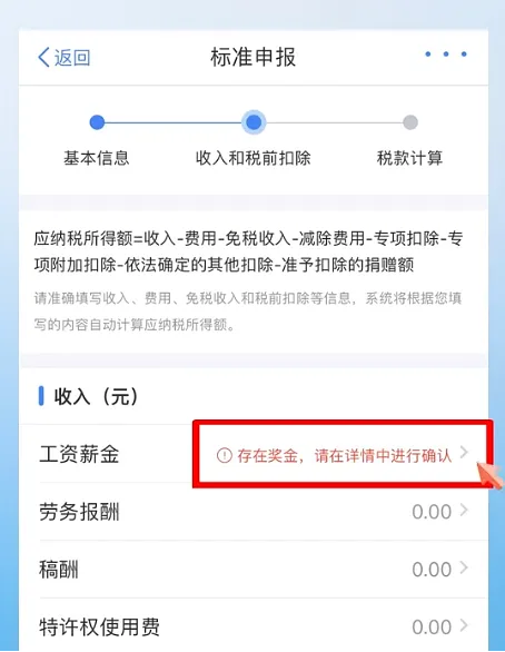 进入申报数据界面,系统会提示“存在奖金,请在详情进行确认”。点击【工资薪金】,选择【奖金计税方式选择】,可根据实际情况选择单独计税或全部并入综合所得计税,可以在未提交申报前尝试不同的选择,查看计税结果来选择最优方案。保存即可,点击【下一步】。