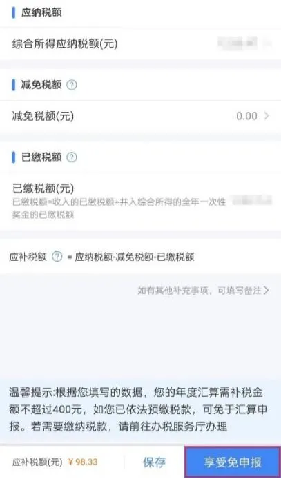 税款计算界面,左下角显示应补税额。若收入不足12万元且有应补税额,或者收入超出12万元但应补税额≤400元,申报提交后无需缴款,点击【享受免申报】。