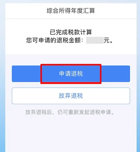 若税款计算界面,左下角显示应退税额,点击【下一步】,则可申请退税或者放弃退税,选择申请退税,系统会自动提交到税务局,请耐心等待即可。