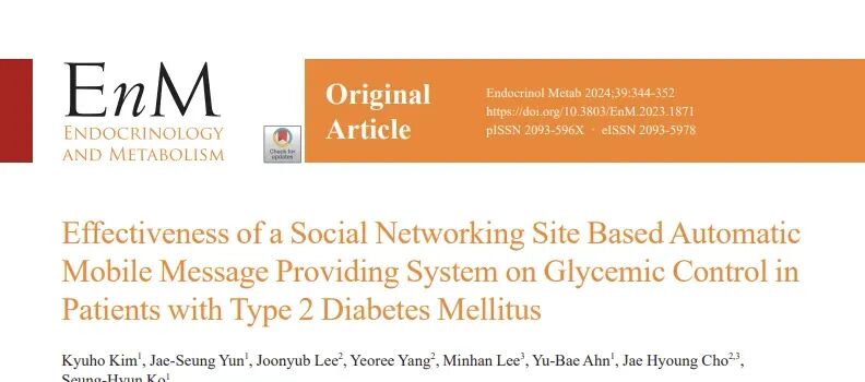 Kim K, Yun JS, Lee J, Yang Y, Lee M, Ahn YB, Cho JH, Ko SH. Effectiveness of a Social Networking Site Based Automatic Mobile Message Providing System on Glycemic Control in Patients with Type 2 Diabetes Mellitus. Endocrinol Metab (Seoul). 2024 Apr;39(2):344-352. doi: 10.3803/EnM.2023.1871. Epub 2023 Dec 27. PMID: 38148106; PMCID: PMC11066440.