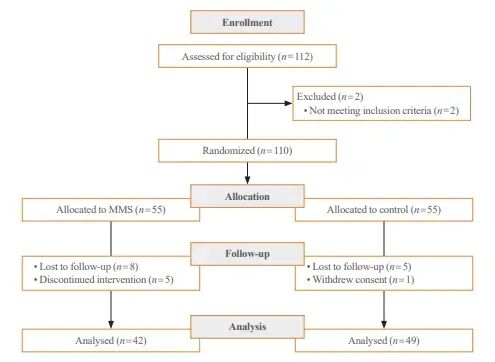 本研究是一项为期3个月的随机、开放标签、对照、平行分组临床试验,旨在评估基于社交网络的自动移动消息推送系统(CiSTEP-PCA)对2型糖尿病患者血糖控制的影响。研究于202211月至20235月在韩国天主教大学圣文森特医院开展,共筛选112名参与者,最终纳入110名,按1:1比例随机分配至移动消息系统组(MMS组,n=55)或对照组(n=55)。