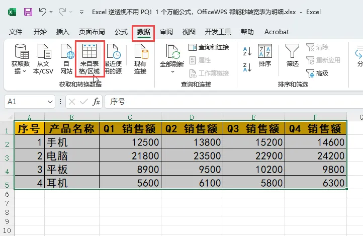 进入 PQ 编辑器:选中表格 → 单击【数据】选项卡 → 选择【来自表格 / 区域】,Excel 会自动将表格转换为超级表并加载到 PQ 编辑器。