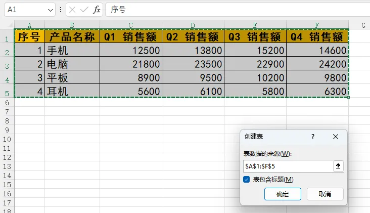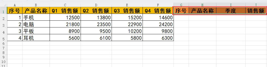 搭建框架:在目标区域(如 G1:J1)输入标题:序号、产品名称、季度、销售额。