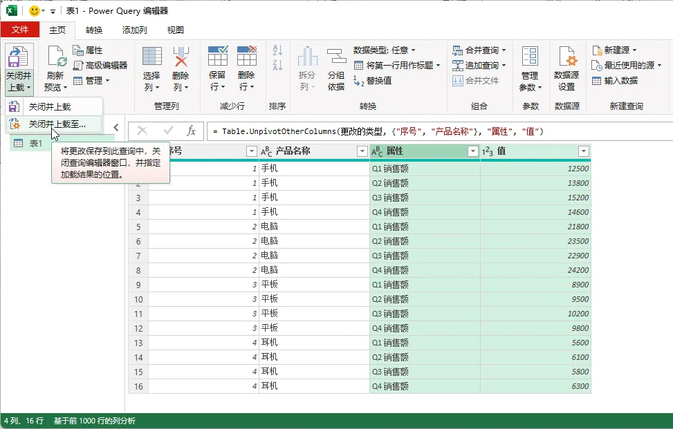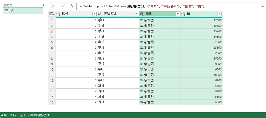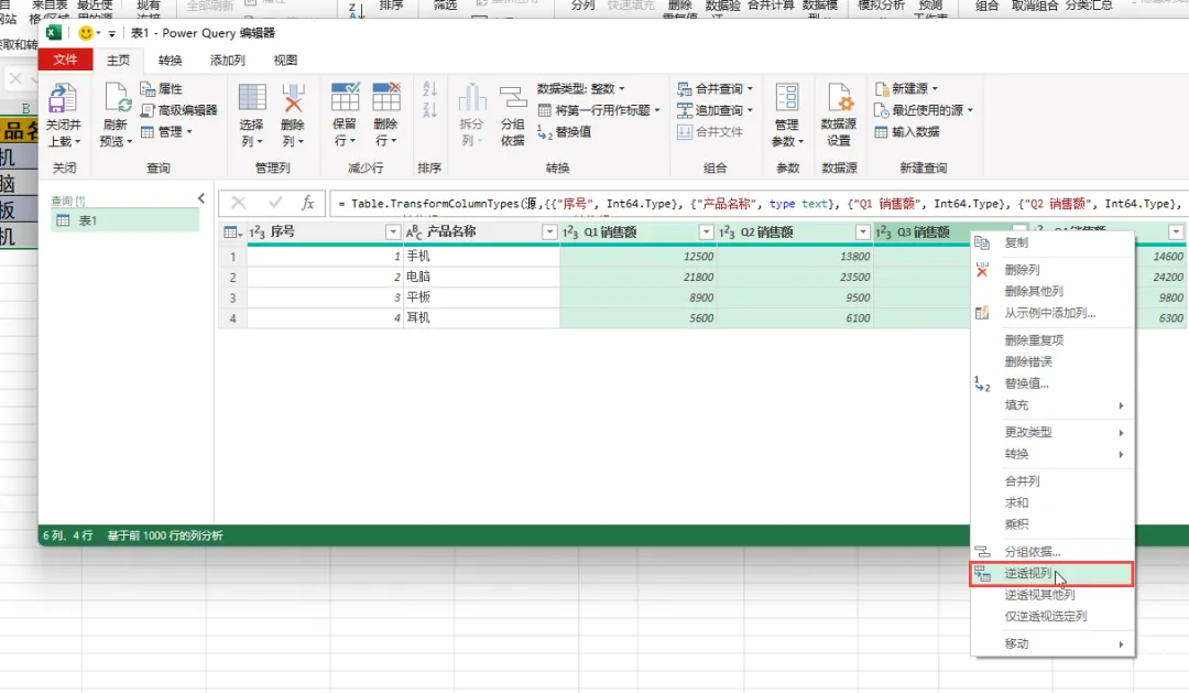 逆透视列:按住 Ctrl 选中所有季度列(如 Q1、Q2、Q3、Q4)→ 右键点击 → 选择【逆透视列】,瞬间将宽表转为明细窄表。