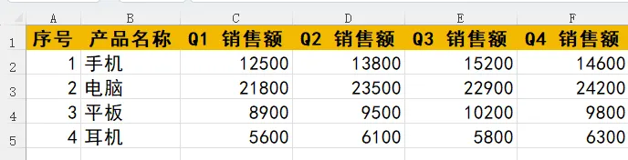 我们以「电子产品季度销售额」为例,原始宽表如下:
