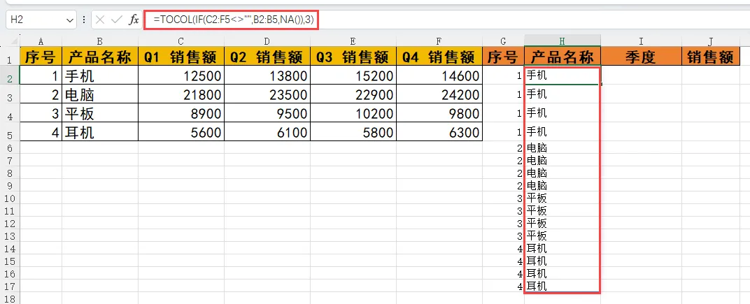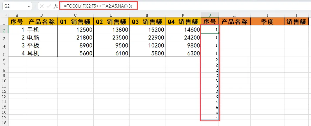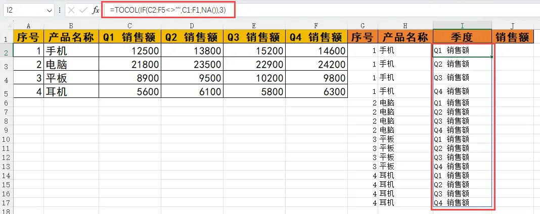 不管是序号、产品名称、季度还是金额,公式的核心就是 “换中间的数据区域”: