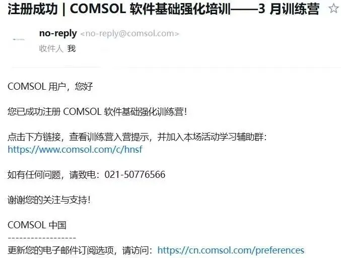扫描文末二维码,进入COMSOL官网注册免费参加,注册完成后,至邮箱查看参会回执信息,扫描二维码进入训练营专属微信群答疑群(群内发放学习资料、通知和答疑安排等)。