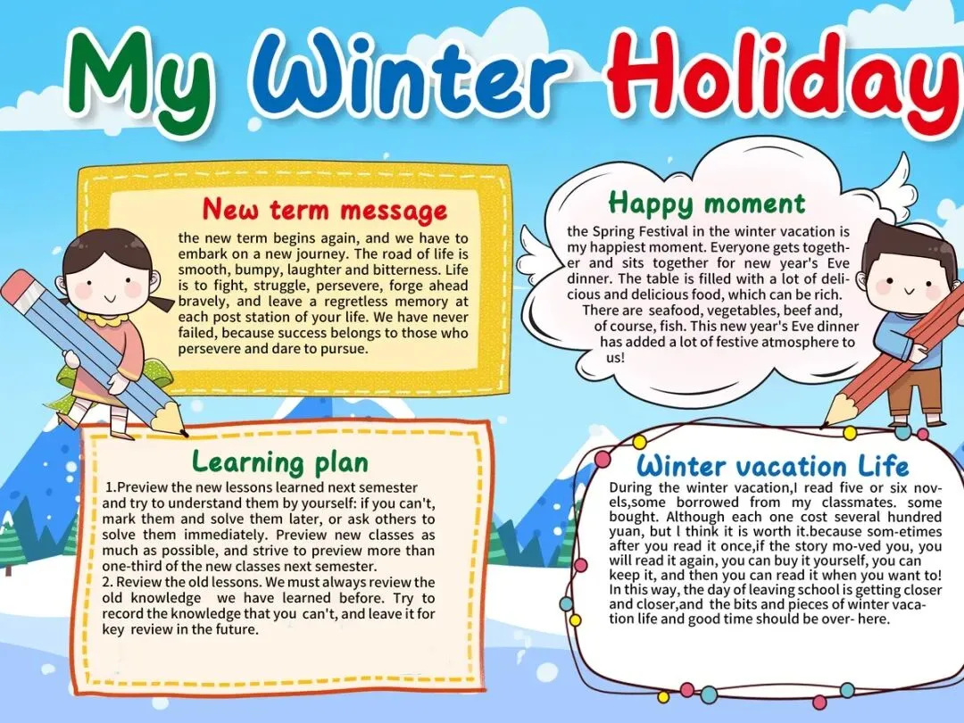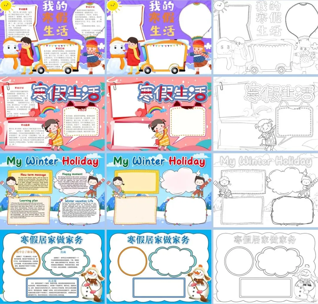 内容涵盖寒假生活小报、学习计划表、安全教育、作业封面等五大实用主题。无论是记录假期精彩瞬间,还是制定新学期学习目标,都能找到合适的模板。A3A4双尺寸设计,满足不同作业要求,彩色成品和线稿涂色两种版本,既能直接使用也能发挥创意。