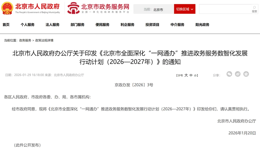 近日,北京市人民政府办公厅公开发布了《北京市全面深化“一网通办”推进政务服务数智化发展行动计划(2026—2027年)》。