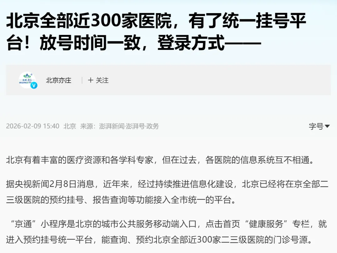 根据“澎湃新闻·澎湃号·政务”的消息,目前“京通”小程序搭建了预约挂号统一平台,方便北京人民查询、预约北京全部近300家二三级医院的门诊号源。“京通”APP也即将上线,届时北京近300家医院的预约挂号,一个APP全搞定!
