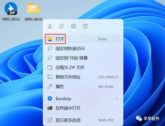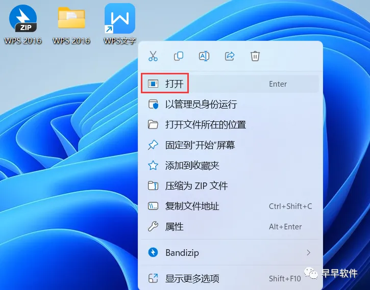 7、软件安装结束后,回到桌面,右键桌面上的【WPS文字图标】,点击【打开】