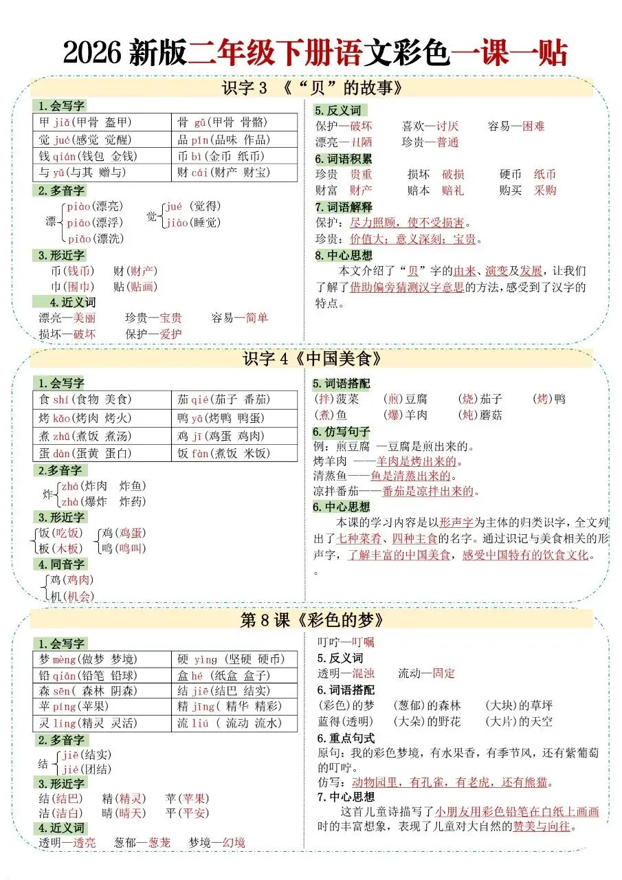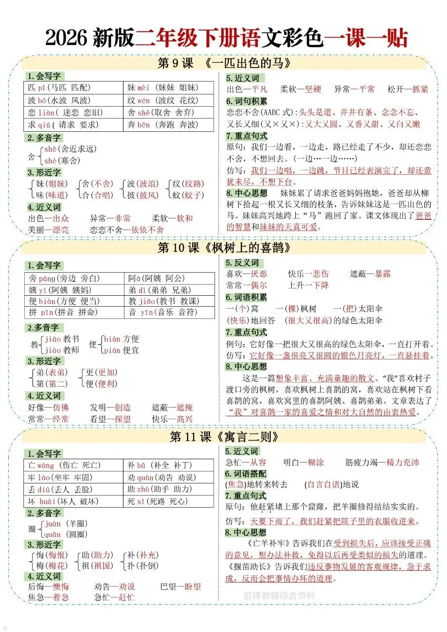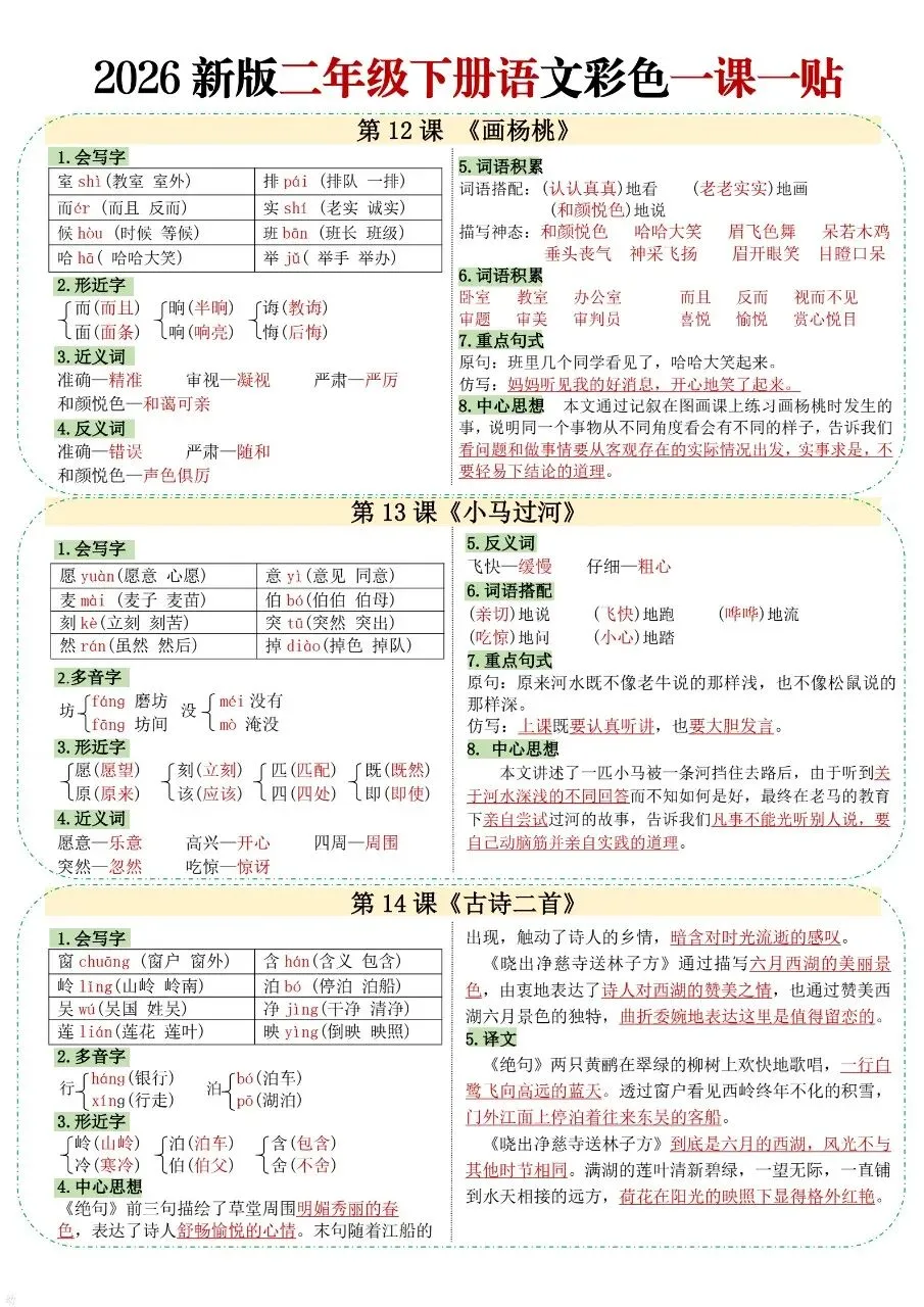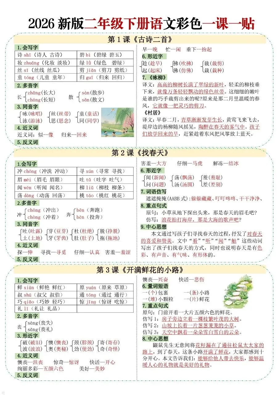 2026 新版二年级下册语文彩色一课一贴电子版免费下载!