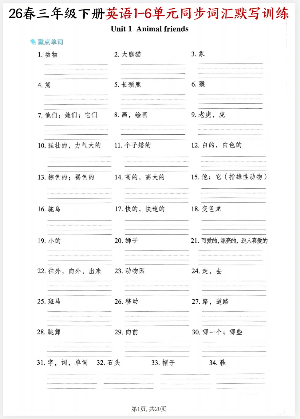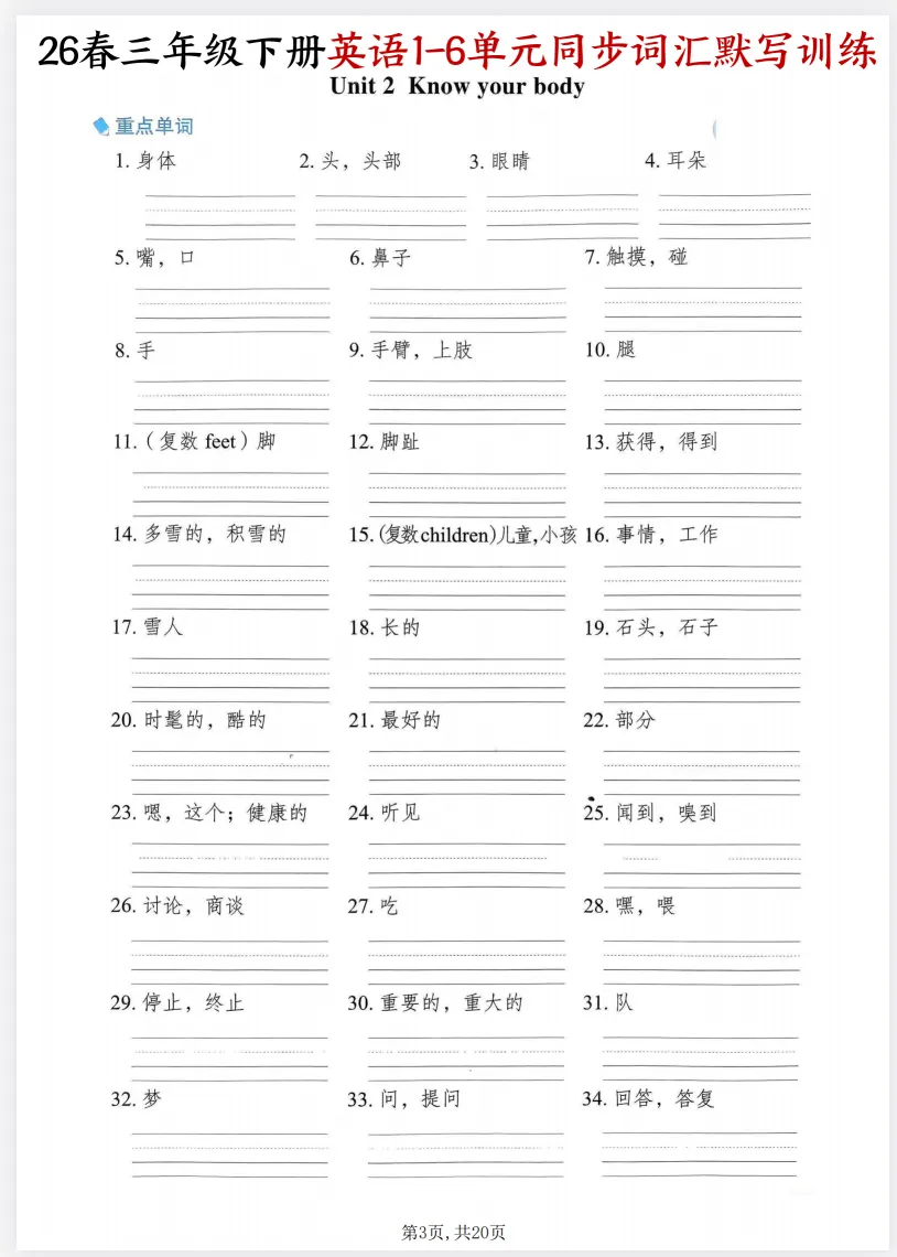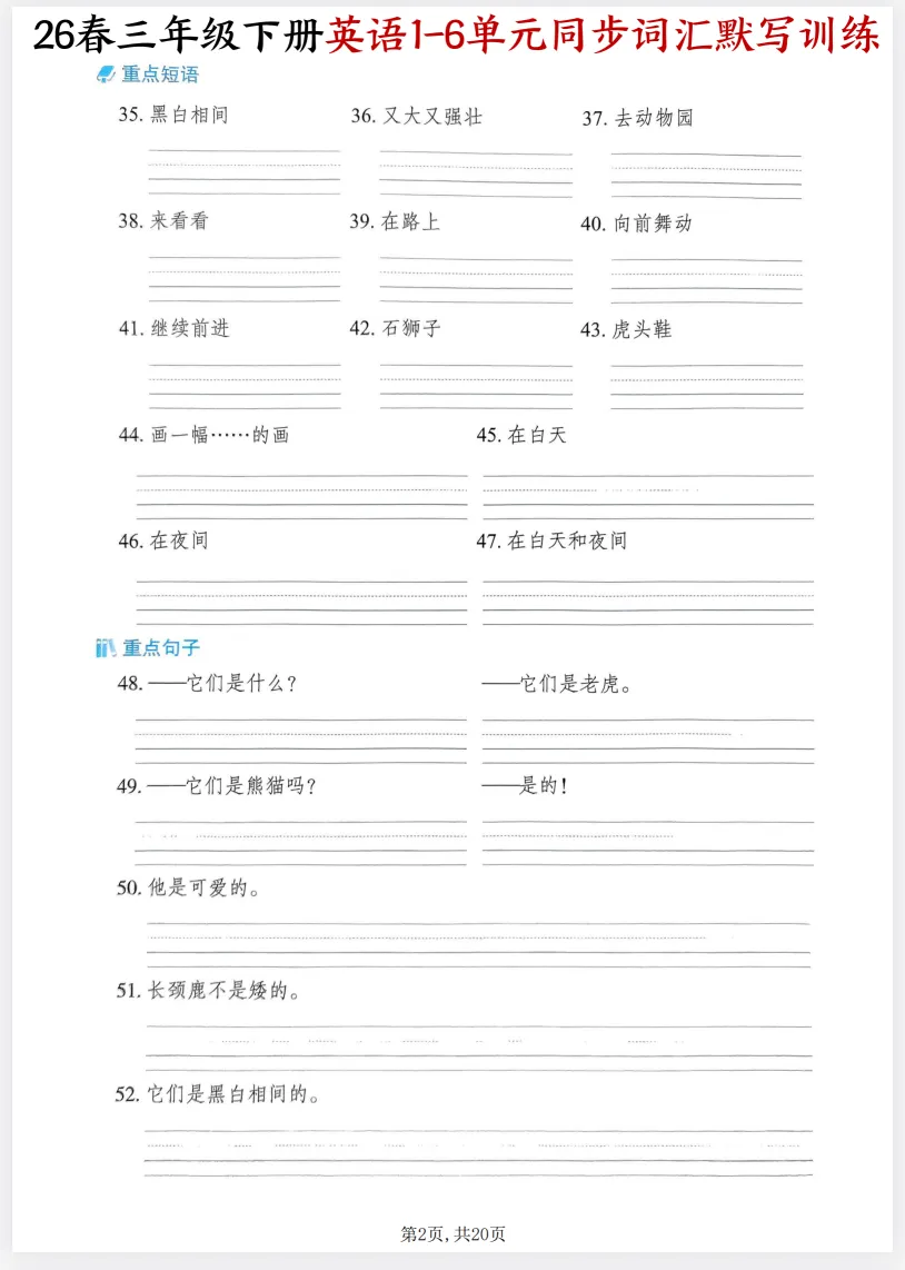 三年级下册英语词汇记不住?这份同步默写训练太实用了!核心单词、短语和句子全覆盖,孩子每天默写一遍,基础扎实不丢分!