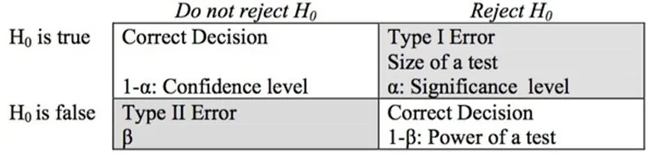 功效(power):正确拒绝零假设的概率,即1-β。当检验结果是不能拒绝零假设,人们又需要进行决策时,需要关注功效。功效越大,犯第二类错误的可能性越小。
