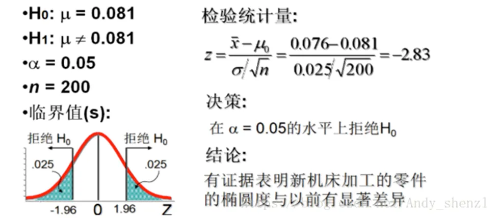 举个例子:某机床厂加工一种零件,根据经验知道,该厂加工零件的椭圆度近似服从正态分布,其总体均值为μ=0.081mm,总体标准差为σ= 0.025 。今换一种新机床进行加工,抽取n=200个零件进行检验,得到的椭圆度为0.076mm。试问新机床加工零件的椭圆度的均值与以前有无显著差异?(α=0.05)