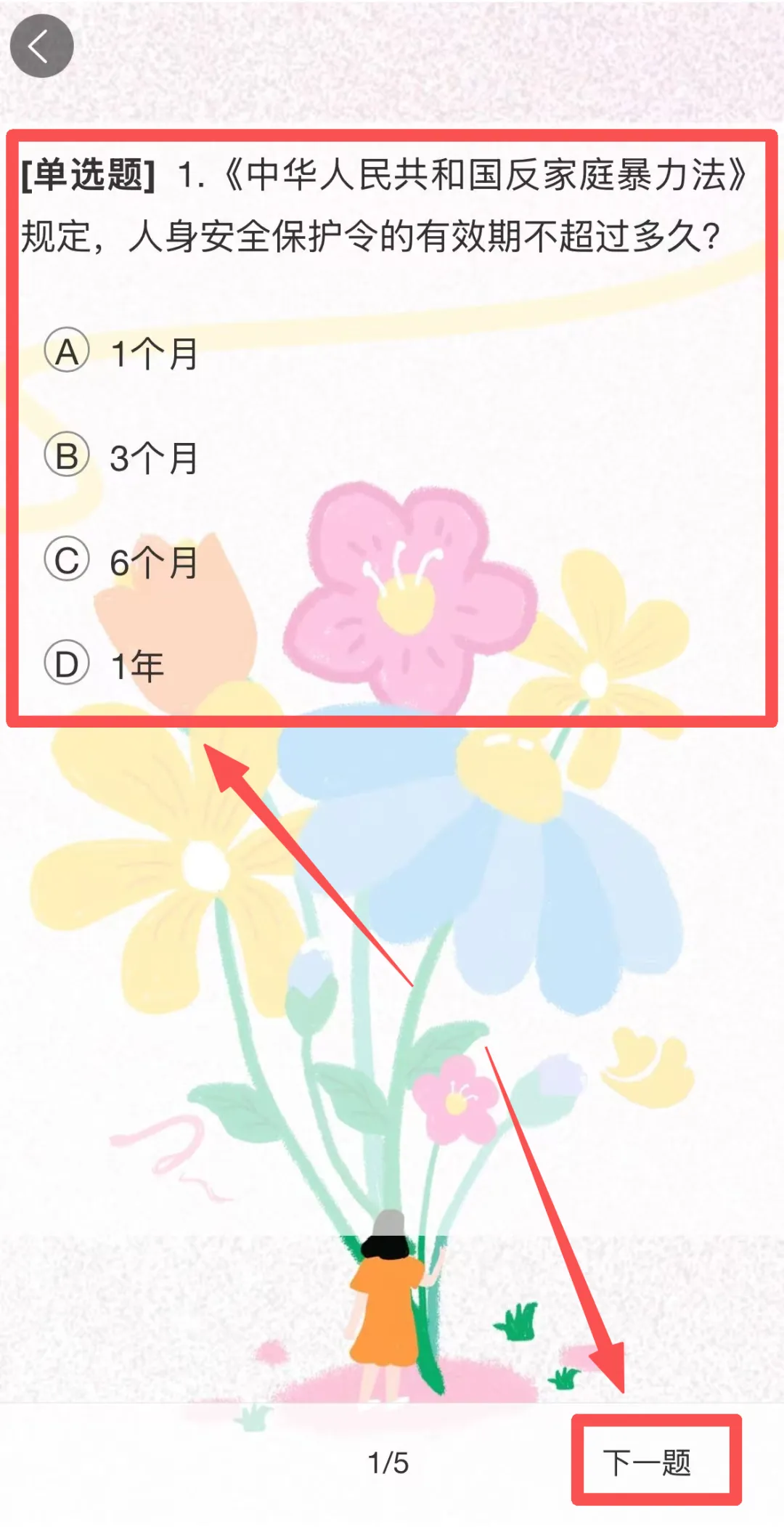 6.点击“正确答案”后,再点击“下一题”,答对3题即可参与抽奖