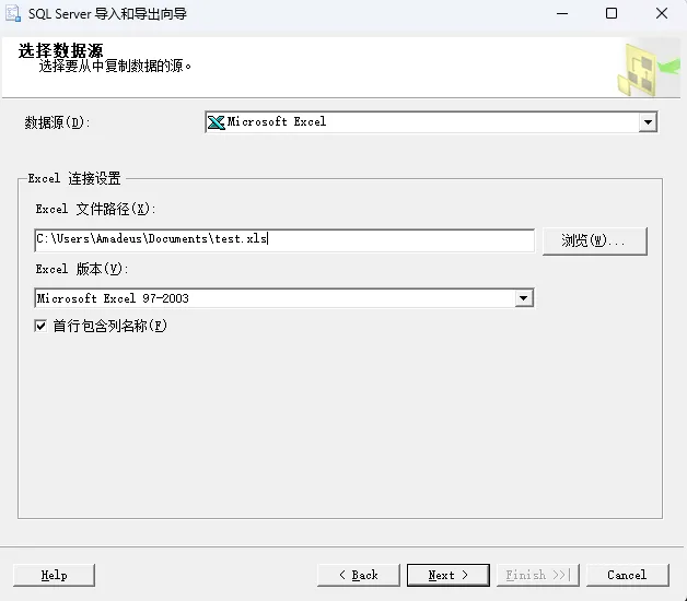 • 数据源:选择 Microsoft Excel。 -