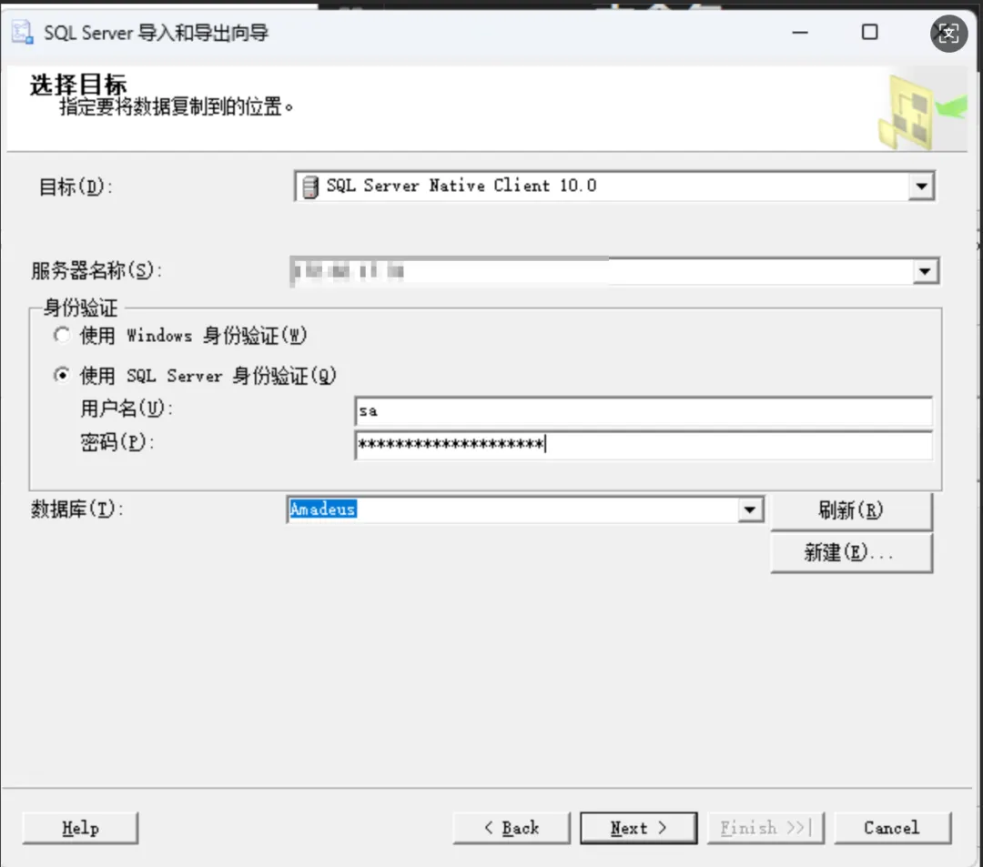 • 目标:选择 SQL Server Native Client(或Microsoft OLE DB Provider for SQL Server)。 -