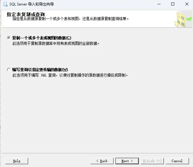 在这个界面,选择 “复制一个或多个表或视图的数据”。这是最简单直接的方式,适合整表导入。