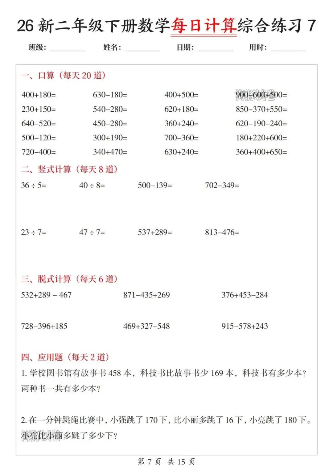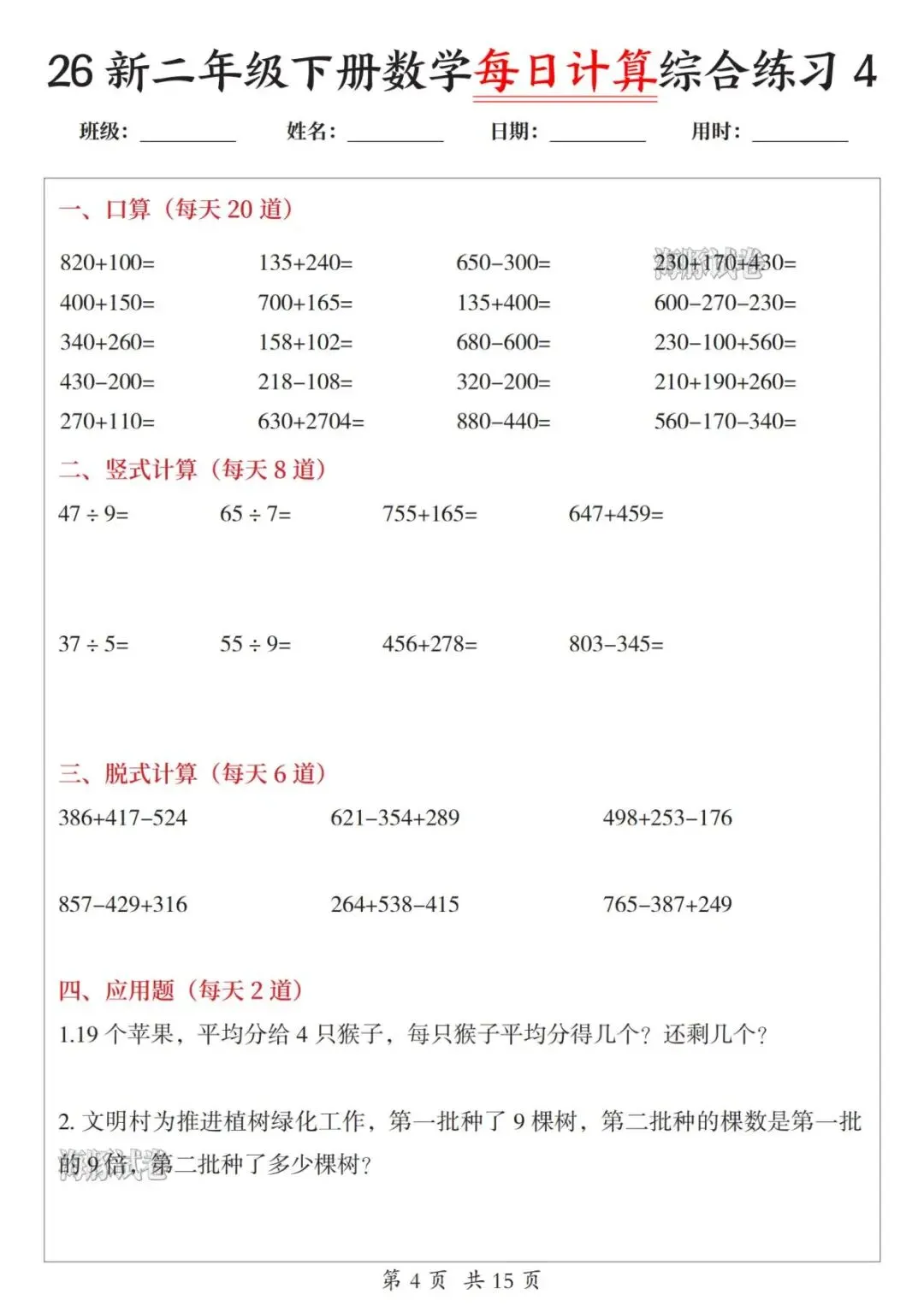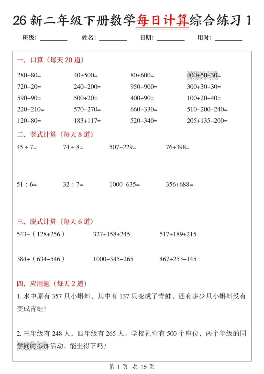 26新二年级数学下《每日计算综合练习》PDF可打印