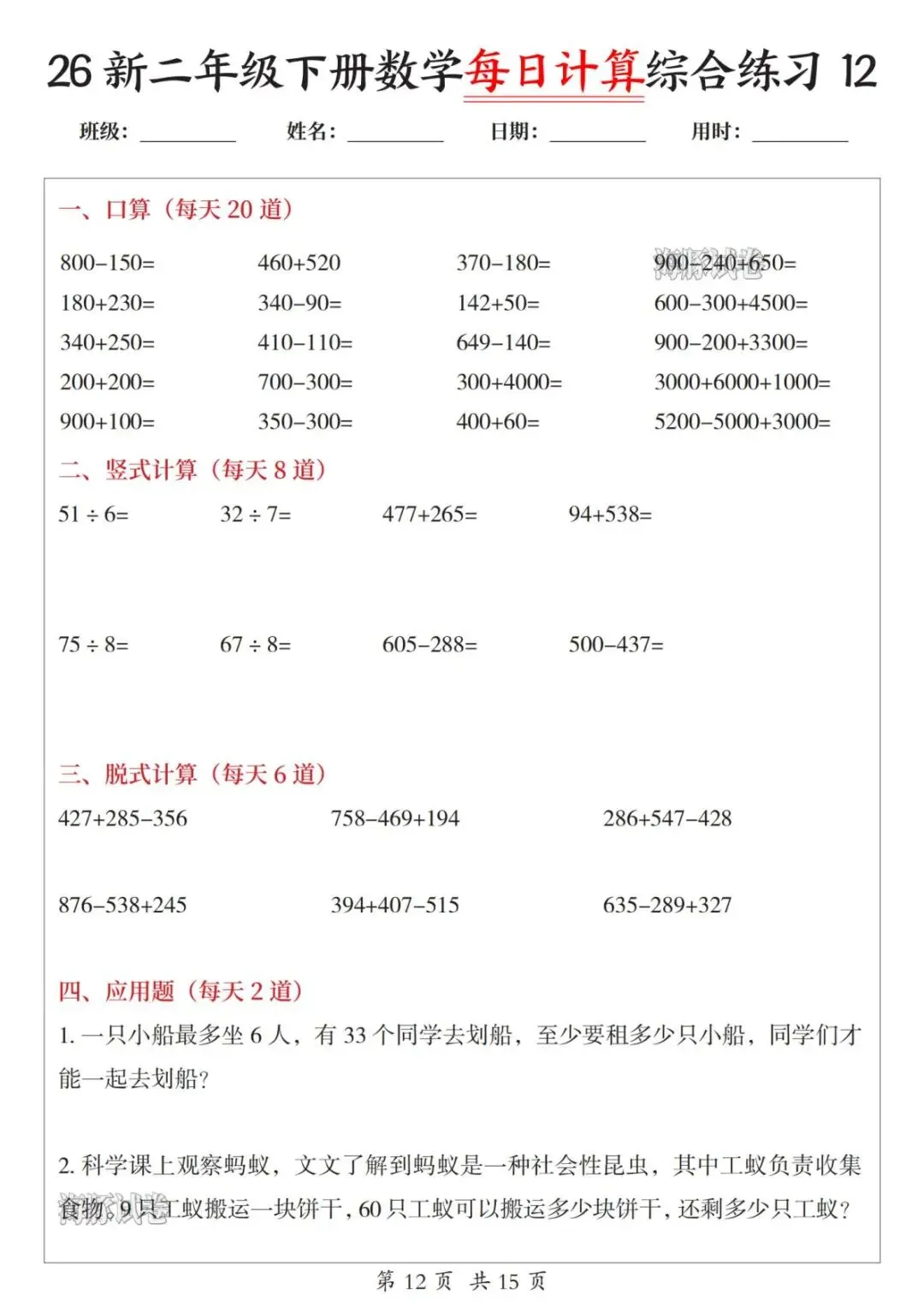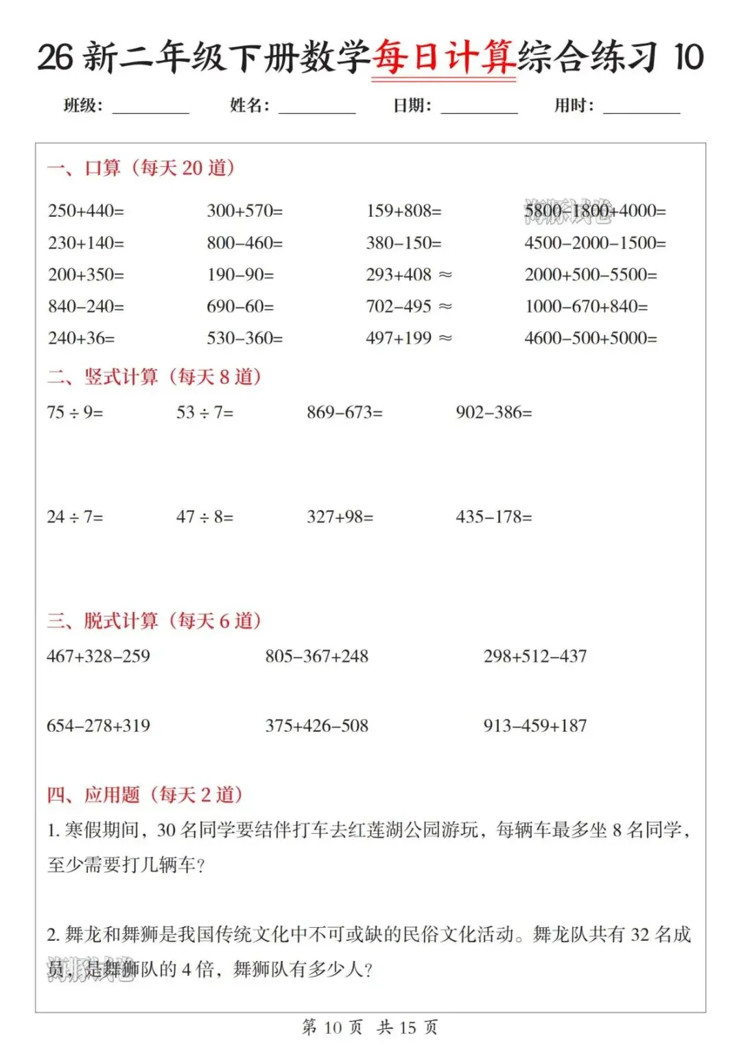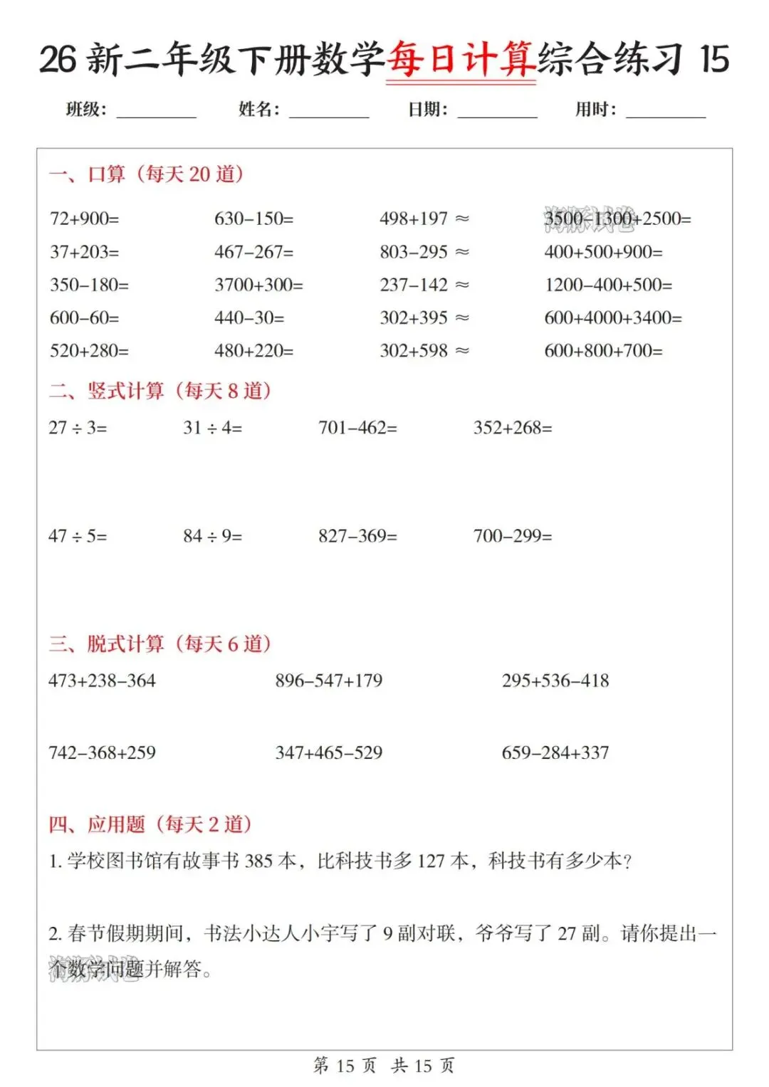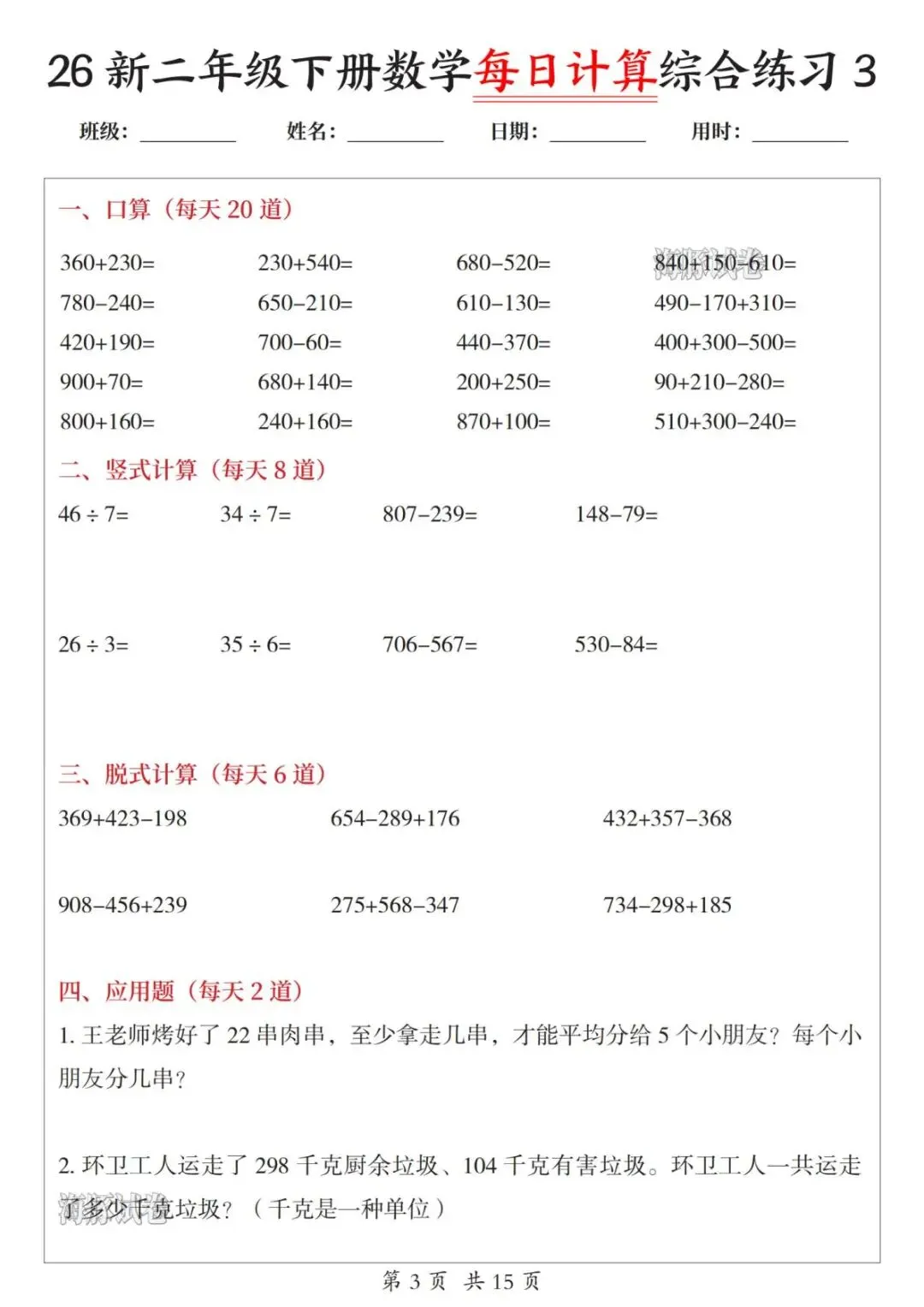 26新二年级数学下《每日计算综合练习》PDF可打印