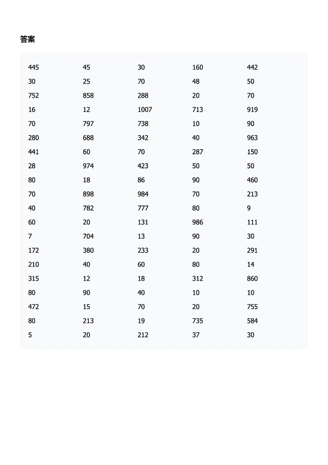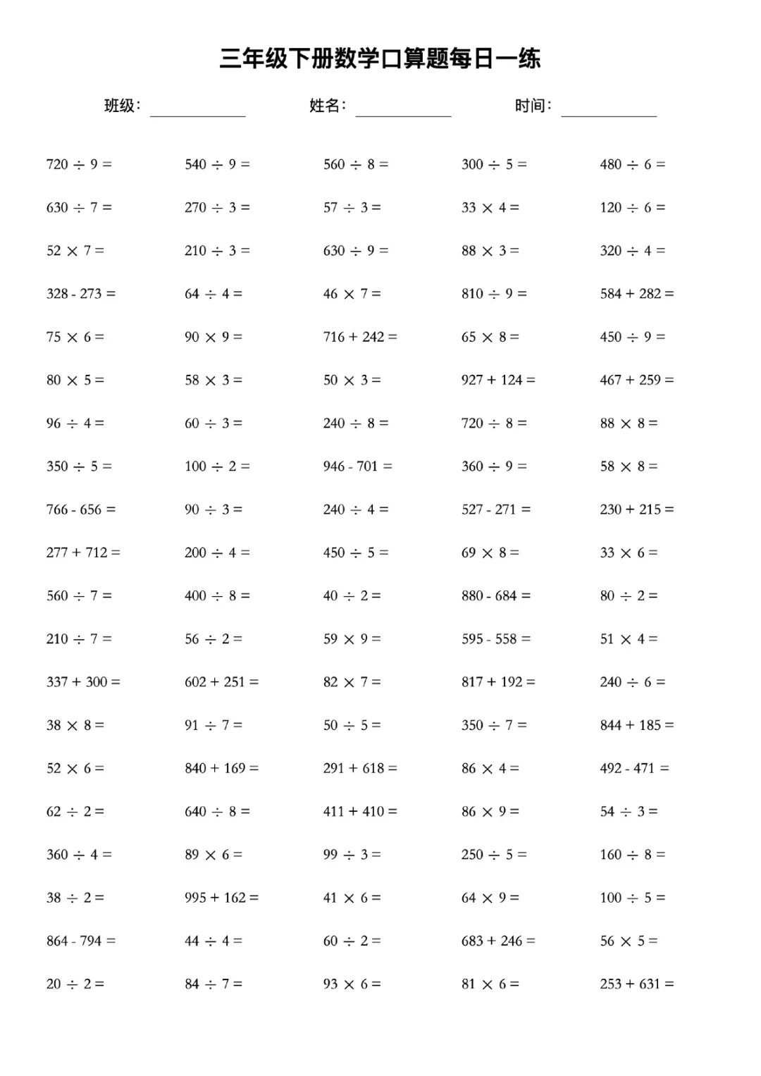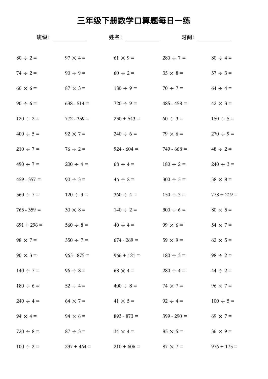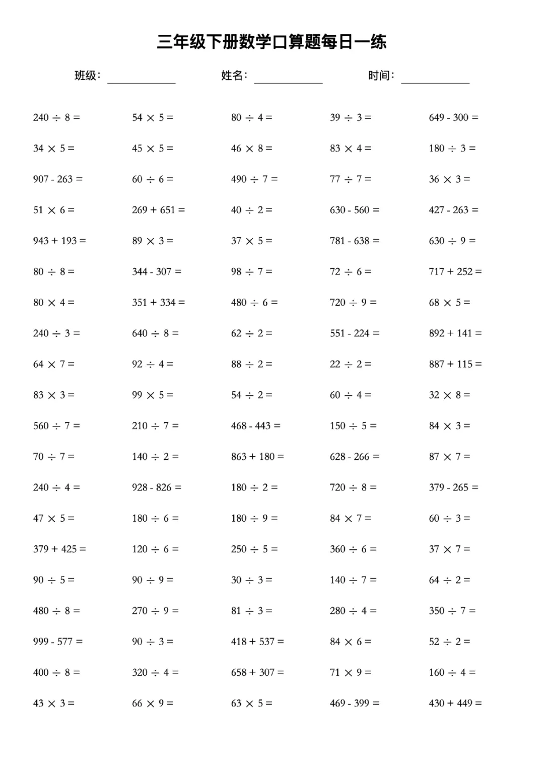 三年级下册数学口算天天练电子版可打印带答案