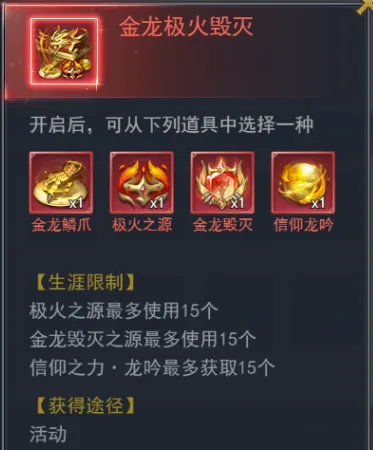 可自由选择自己想要的大奖,可以选择的大奖有赤焱龙心宝箱、金龙极火毁灭宝箱、多一半钻石肠;抽奖过程中可随时更换自己想要的大奖。