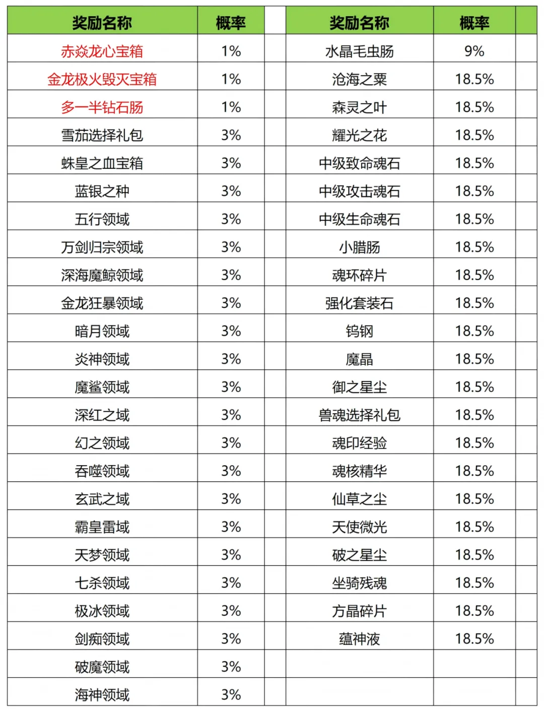各奖励抽取概率: