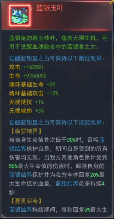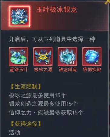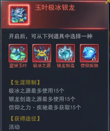 【玉叶极冰银龙】使用后可选择获得“蓝银玉叶”、“极冰之源”、“银龙创造之源”、“信仰之力·疾驰”。