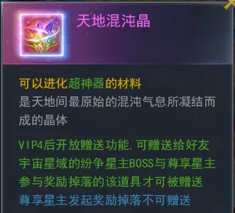 【天地混沌晶】进化超神器的材料,开启二级神位后可使用。