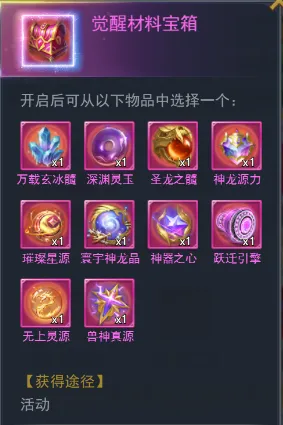 【中枢觉醒材料自选】用于觉醒中枢装备,获得强力觉醒技能(开启神界中枢后才能使用,请谨慎选择)。