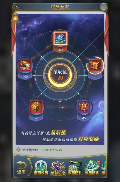 活动期间,每次寻宝可获得1点星辰值,星辰值达标即可领取对应奖励