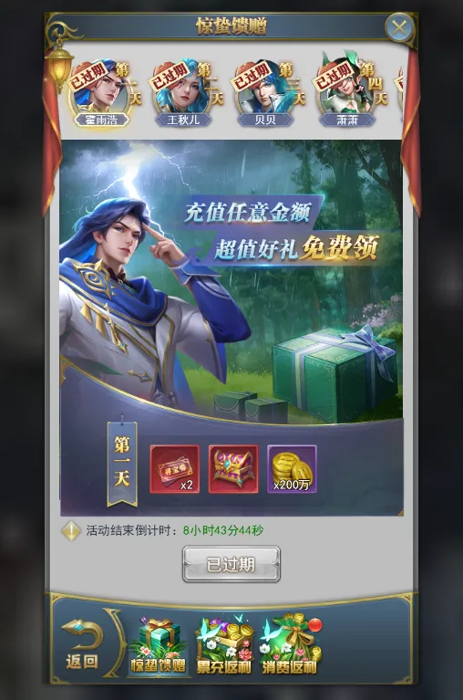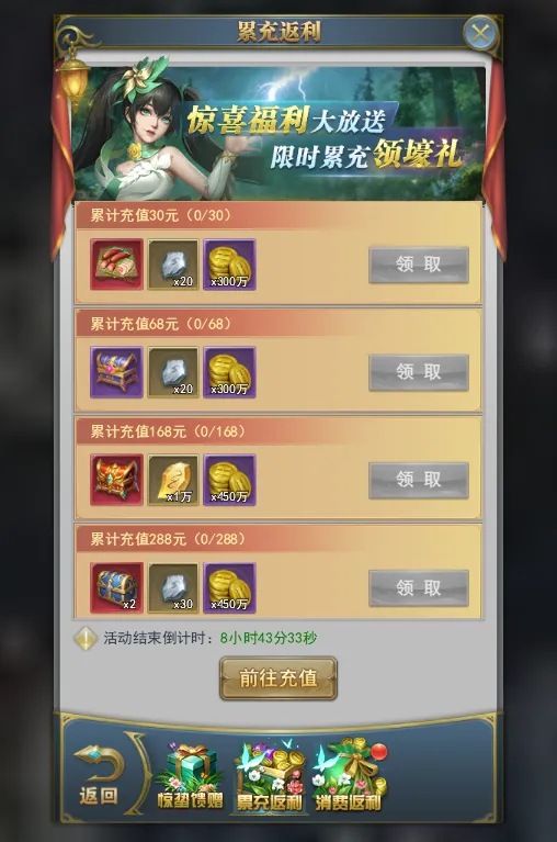 活动期间,充值到指定额度可领取对应奖励。