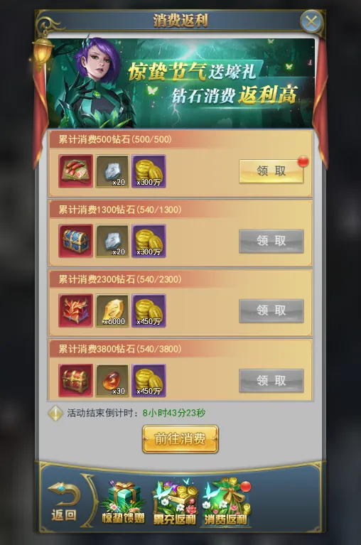活动期间,消费钻石到指定额度可获得对应奖励。
