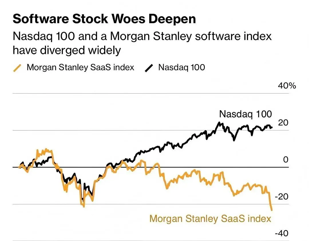 摩根士丹利SaaS软件指数与纳斯达克100指数逐渐背离