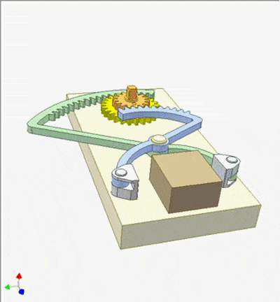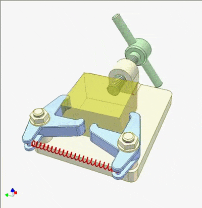 两个对称的V形杠杆使黄色工件在纵向上居中。