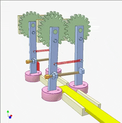 平行四边形机构的绿色连杆使黄色工件沿纵向居中。