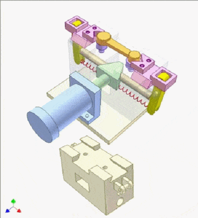 粉色凸轮杆控制夹紧过程,红色弹簧保持凸轮和起绒器之间的接触。它也可用于冲压底切工件(软金属)的模具。
