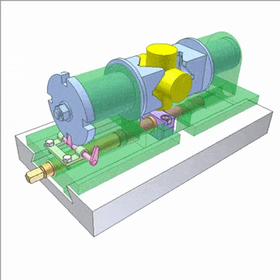 具有左右手螺纹的橙色螺钉移动V型块,使黄色工件在横向和纵向上居中。绿色滑块上的蓝色螺母和红色螺钉用于沿纵向调整中心位置。