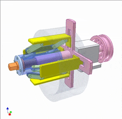 转动橙色螺丝,径向移动黄色条,使线圈居中(玻璃中)。然后转动线圈进行开卷,粉红色轴端的制动鼓用于产生开卷张力。这里应用椭圆机构(黄色条和蓝色轮毂,绿色连杆)将蓝色轮毂的线性运动转换为黄色条的线性运动。平行四边形机构用于支撑黄条。该开卷机适用于宽度较小的线圈。