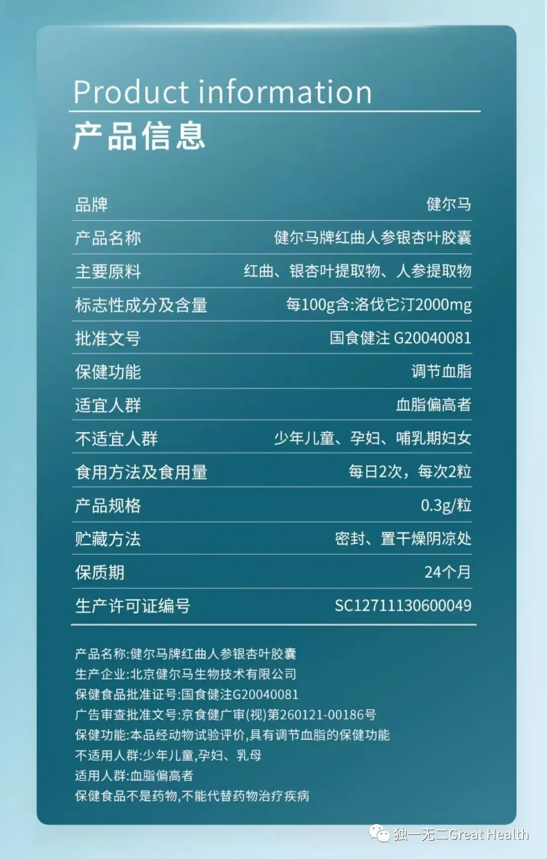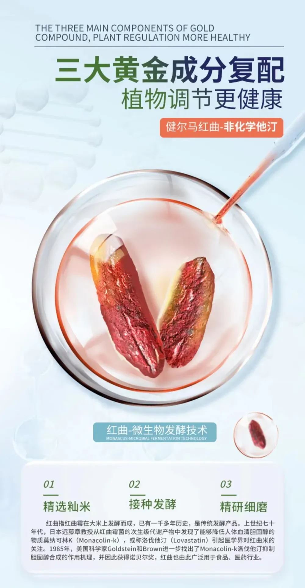 健尔马红曲采用生物发酵,植物萃取技术,运用中医君臣佐使理念,实现红曲+人参提取物+银杏提取物的科学配方,全天然的生物他汀,解决了化学他汀毒副作用大、安全性差的难题。含量高、稳定性强。解决了其他生物他汀含量低、稳定性差的难题,每100g含有2000mg,是2004年国家最后一批审核认证跟药品含量几乎一样的配比。