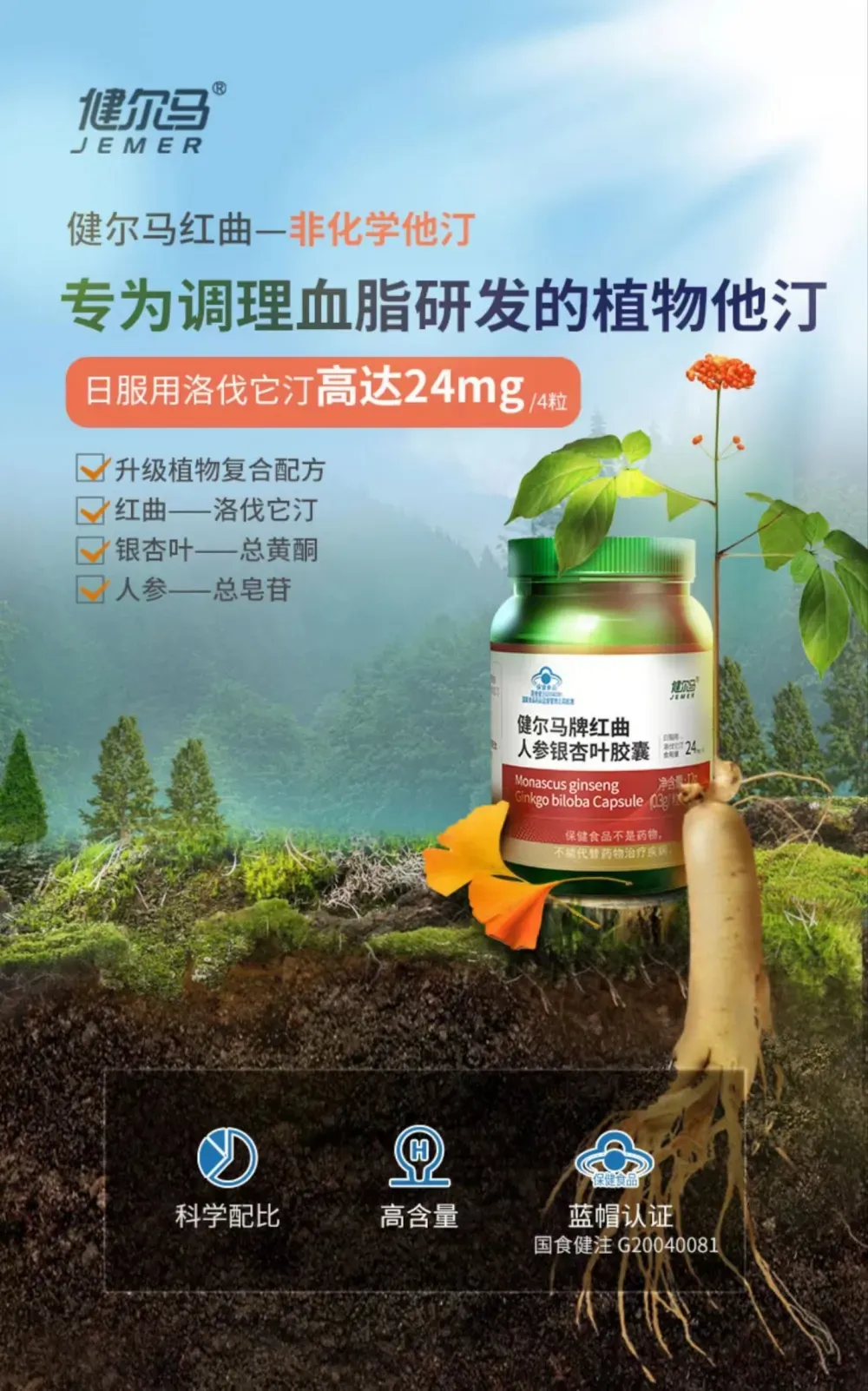 A:本产品是升级植物复合配方,富含三重植物精华红曲洛伐它汀(Monacolin K)+银杏叶总黄酮+人参总皂苷,每粒洛伐它汀含量高达6mg,一天服用高达24mg洛伐它汀,不含药物成分,能够调节血脂
