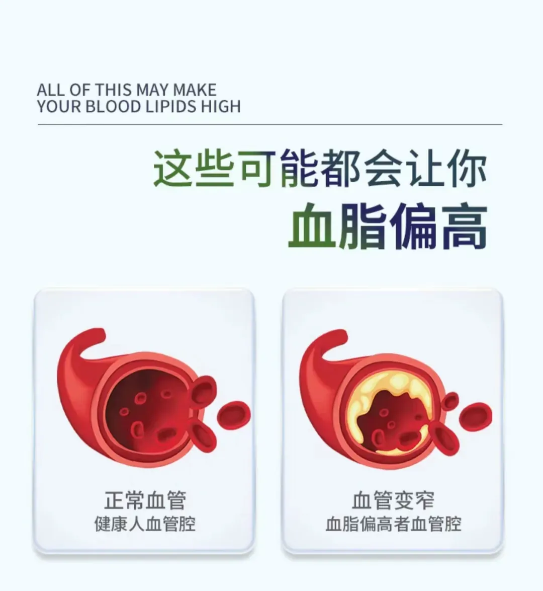 – 早期症状:通常无症状,需通过血液检查发现。 – 长期危害: – 动脉粥样硬化 → 冠心病、心绞痛、心肌梗死。 – 脑血管狭窄 → 中风、短暂性脑缺血发作(TIA)。 – 外周动脉疾病 → 下肢麻木、疼痛、坏疽。