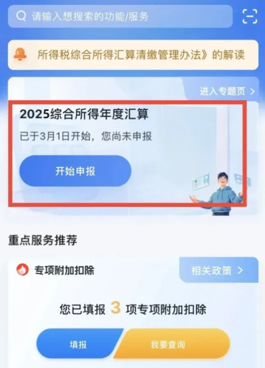 点击首页正中间【2025综合所得年度汇算专题页】,进入申报界面,若出现选择申报年度,选择2025年即可。