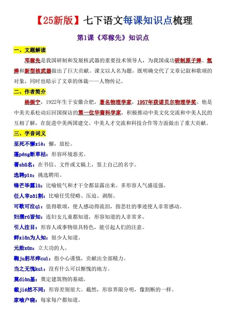 2025-2026学年春季部编版语文七年级下册《每课知识点梳理》,电子版可下载,可打印。这套七下语文每课知识点梳理,帮助孩子预习新课,课后复习总结,掌握基础知识点。